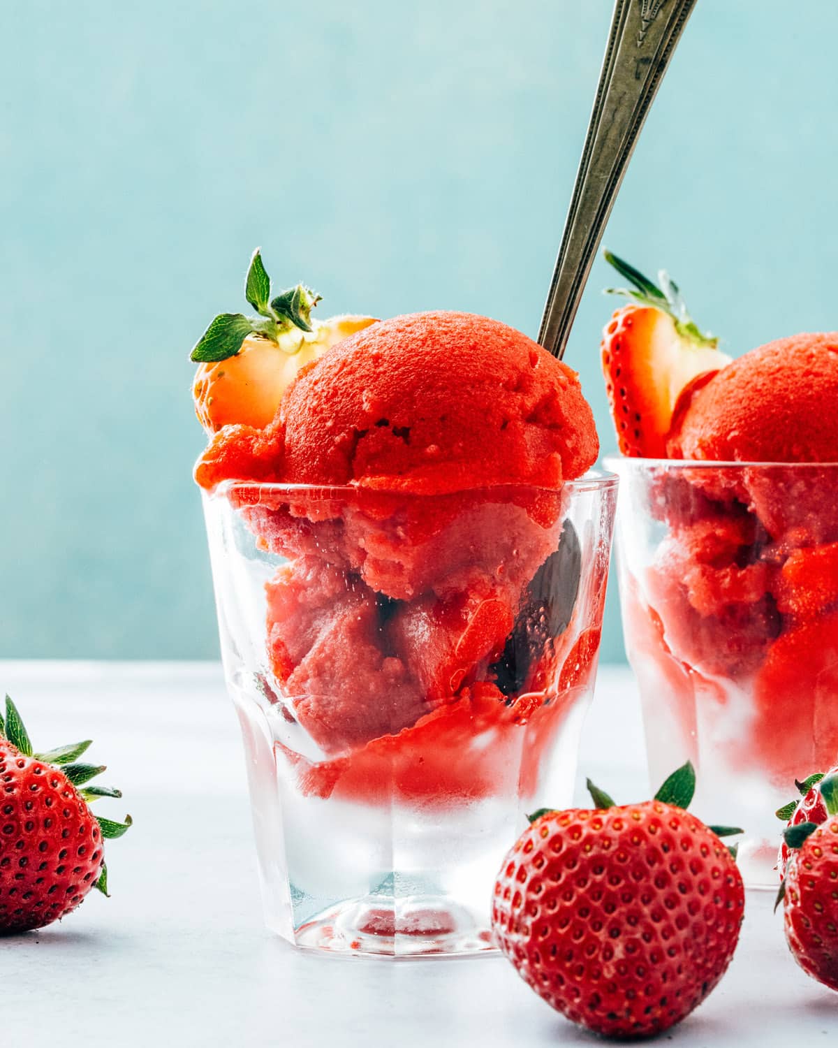 Here’s a simple Mediterranean diet dessert that’s easy but impressive: Strawberry Sorbet! The flavor is like taking a bite of 100 strawberries at once: sweet, pure, and tangy. The frosty texture is like an Italian strawberry gelato: cold and creamy, with just the right robust vibrancy to each bite. For a natural sweetener, use maple syrup instead of sugar.
